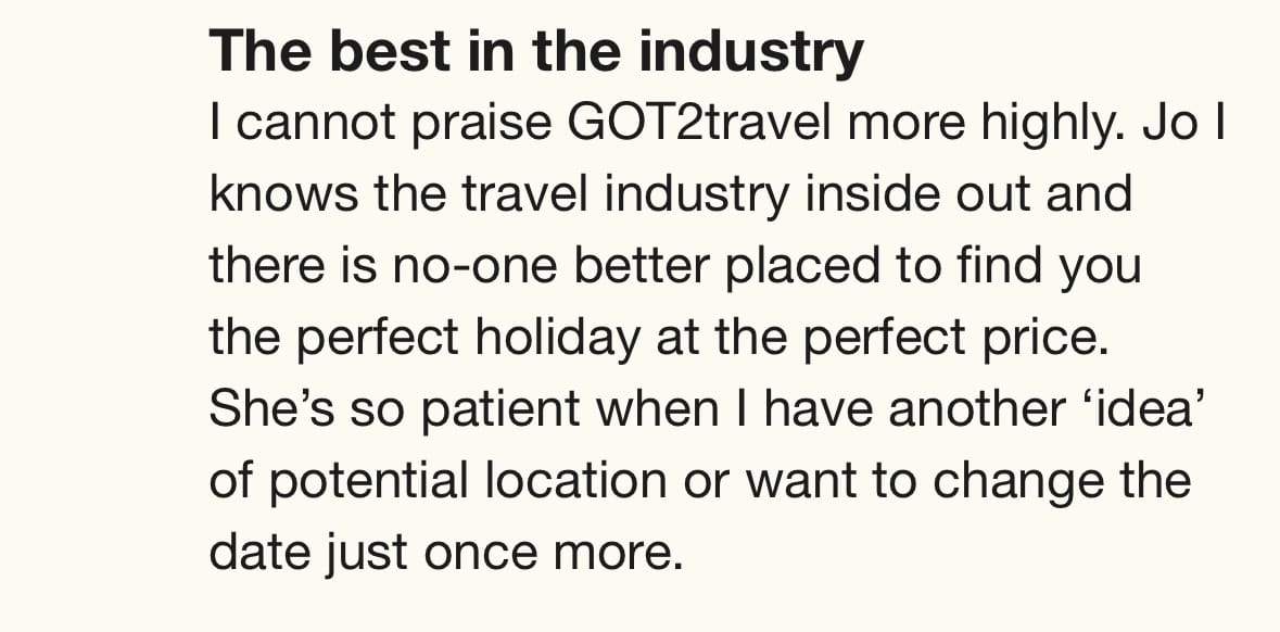 We are GOT2 TRAVEL - an UK award winning travel agency for our customer service and pricing.