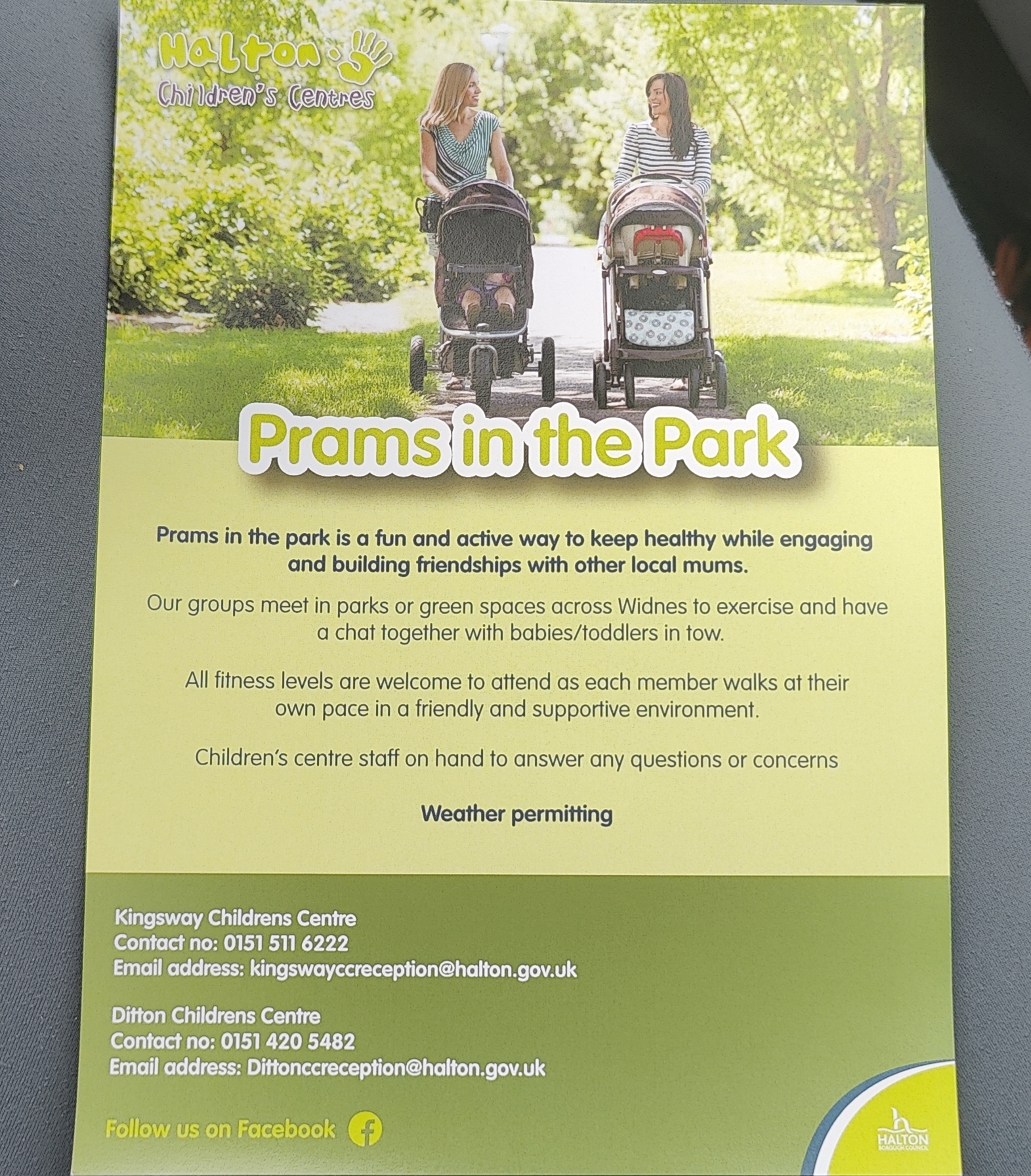 Our groups meet in parks or green spaces across Widnes to exercise and have a chat together with babies/toddlers in tow.